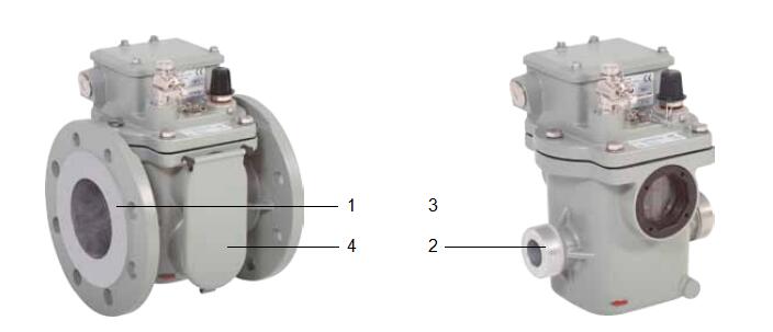 殼體是由耐氣候變化的鑄鋁合金制成,表層已涂色. 依照結(jié)構(gòu)設(shè)計形式可分為法蘭盤(圖3中1)連接或螺紋連接(圖3中2). 對殼體的變型品種選項將在下文第5點(diǎn)(單浮子瓦斯繼電器)和第7點(diǎn)( 雙浮子瓦斯繼電器)中加以說明. 其他選項歡迎垂詢.