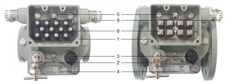 頂蓋是由耐氣候變化的鑄鋁合金制成,表層已涂色. 頂蓋部件上部有一個接線盒(圖4中1),在接線盒前面有一個放氣閥(圖4中2)和一個用悶蓋螺母(圖4中3)覆蓋的測試按鈕,同時上面還附有一個測試按鈕操作說明標(biāo)牌(圖4中4). 接線盒中除了有一個接地點(diǎn)(圖4中5)外,頂蓋底板內(nèi)還裝有電力引線端子(圖4中6). 通過電力引線端子的數(shù)量可以決定涉及干簧管類型與數(shù)量的開關(guān)系統(tǒng)的布線配置.