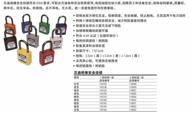 掛鎖是OSHA規(guī)定的上鎖掛牌過程中不可缺少的產(chǎn)品,配合安全鎖具和吊牌完成整個(gè)上鎖掛牌活動(dòng)。掛鎖的作用在于確保在維修維護(hù)活動(dòng)中,工人不會(huì)在無意間打開一臺(tái)其他人正在使用的設(shè)備。而貝迪可為您提供多種選擇,高品質(zhì)的安全掛鎖,銅鎖,鋼鎖以及鋁鎖可滿足不同應(yīng)用場(chǎng)所的需要。